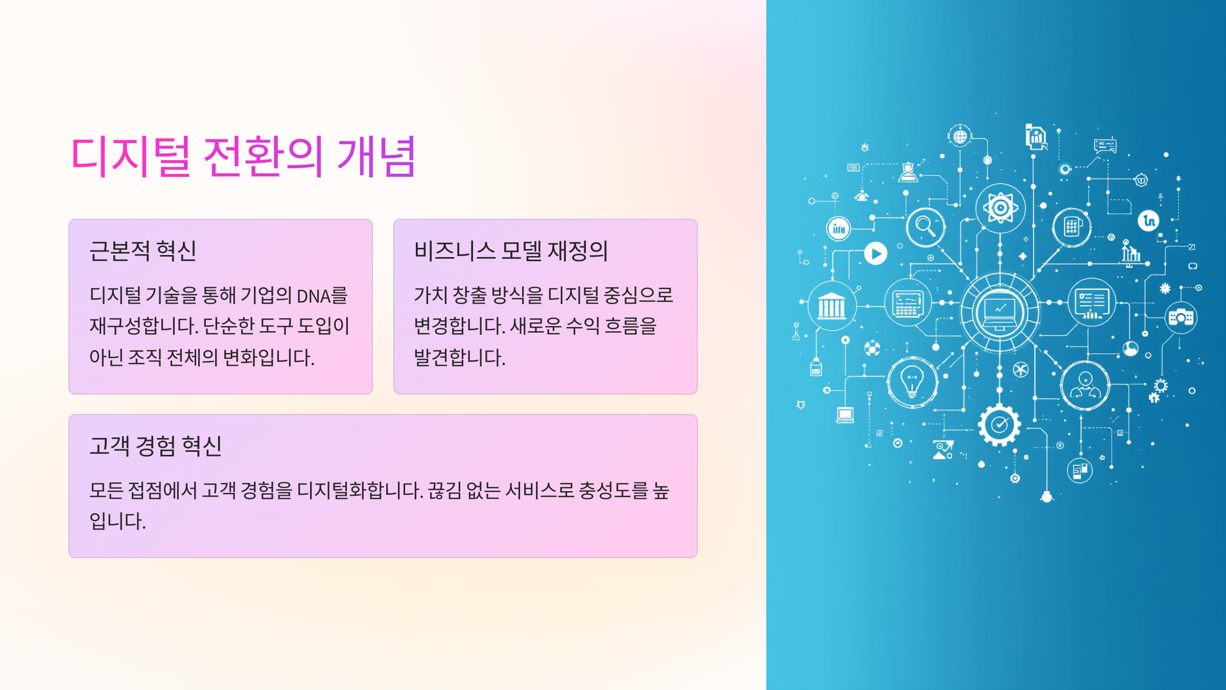 DX는 기업이 기존의 아날로그 방식에서 벗어나 디지털 기술을 중심으로 경영 방식, 조직 문화, 업무 프로세스를 완전히 바꾸는 과정이에요. 핵심은 데이터를 기반으로 빠르게 의사결정을 내리고, 고객 중심의 가치를 창출하는 것이죠.